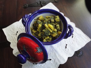 In the meanwhile, my leftover methi leaves find themselves in my mother’s aloo methi and my mother-in-law’s methi-coriander rice. Cooked fenugreek is slightly bitter to the taste, but the flavors are complex and fill my mouth, and it’s a taste that I start to crave. I’ve tried substituting arugula and spinach for methi, but it never works: the flavor of fenugreek is far richer. I use one large yellow or Yukon Gold potato and a big bunch of washed, chopped methi leaves (stalks removed) for the aloo methi.