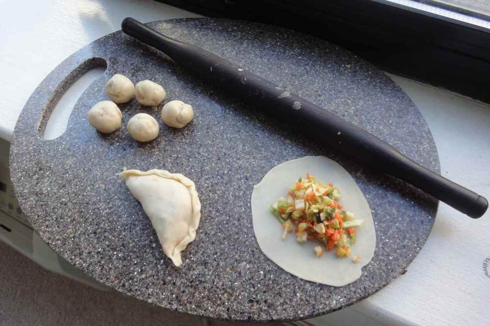 These light dumplings are full of crunchy vegetables such as cabbage, carrot, scallions and green bell peppers which you can vary according to your taste. Their primary flavor comes from finely minced garlic and ginger. I love throwing in a few shiitake or crimini mushrooms into the mix as well. The beauty of these dumplings is that the filling does not have to be cooked and you can chop the vegetables while the dough is resting. However, the filled but uncooked dumplings don’t store too well, as the raw salted vegetables tend to release moisture. Therefore, I recommend making these and eating them quickly, with a side of spicy ketchup.