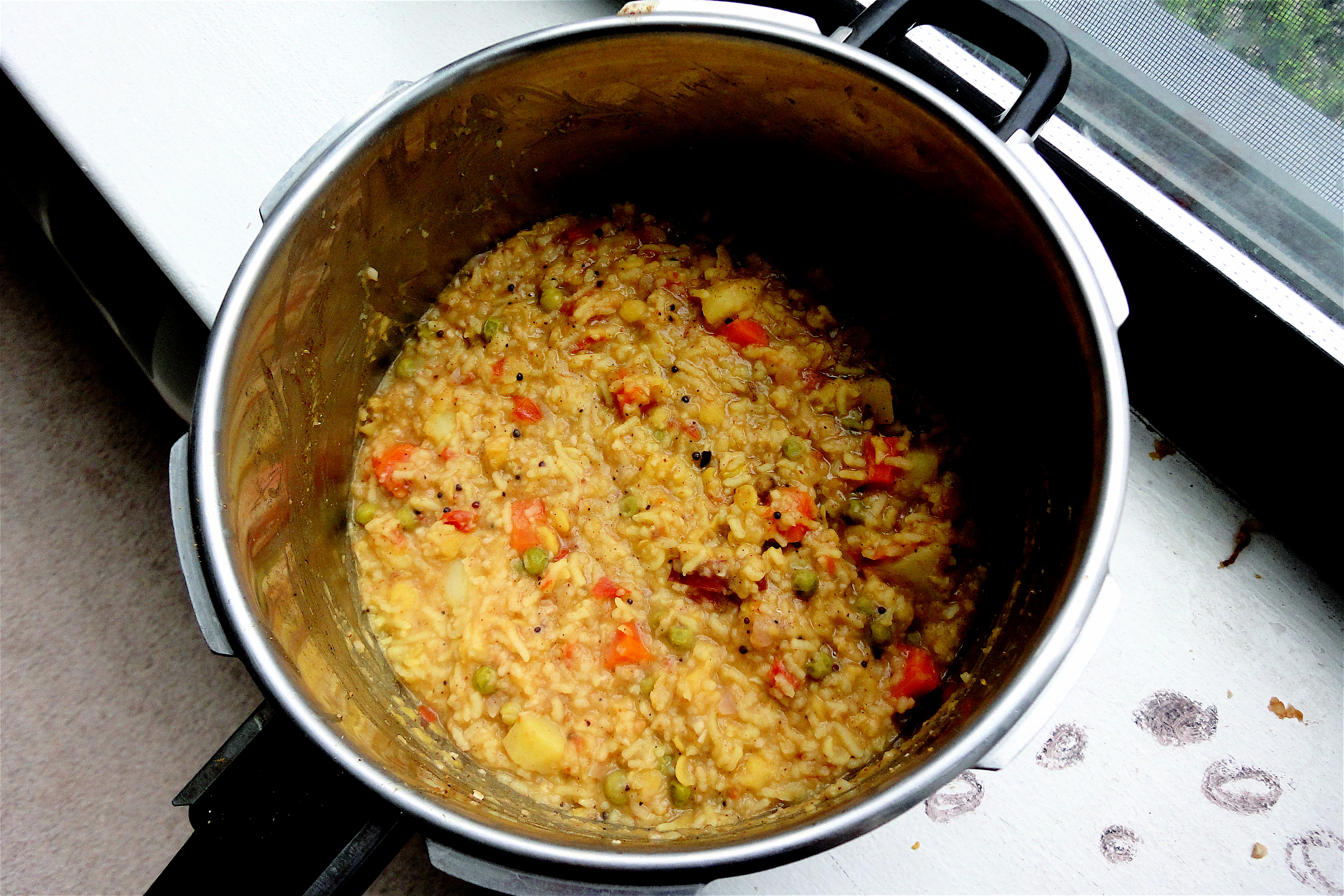 7. Final seasoning: heat 1 tbsp of ghee, sputter mustard seeds and a pinch of garam masala. Add to the rice-lentil mixture and stir.