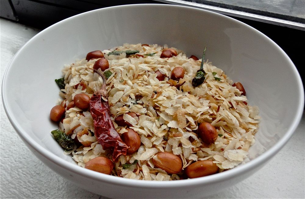 2. In a separate pan, heat the remaining oil on medium heat. Add the mustard seeds, peanuts, red and green chillies (chop into smaller bits if you want spicy mouthfuls), coconut, curry leaves. Let these roast for a few minutes while stirring occasionally, until the peanuts start looking a pale golden. Add in the toasted poha, and stir to combine. Remove from flame. Toss in salt and sugar to taste. Everything, especially the peanuts, should become beautifully crisp upon cooling. Serve immediately or store in airtight containers.