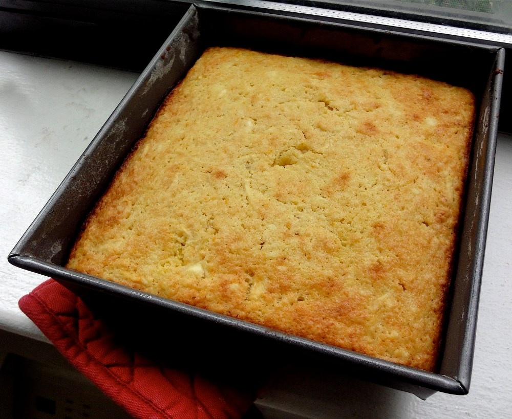 5. Place the batter into the prepared pan, smooth the top, and bake for about 30 minutes, until the cake is golden brown. The sides will start to pull away from the pan.