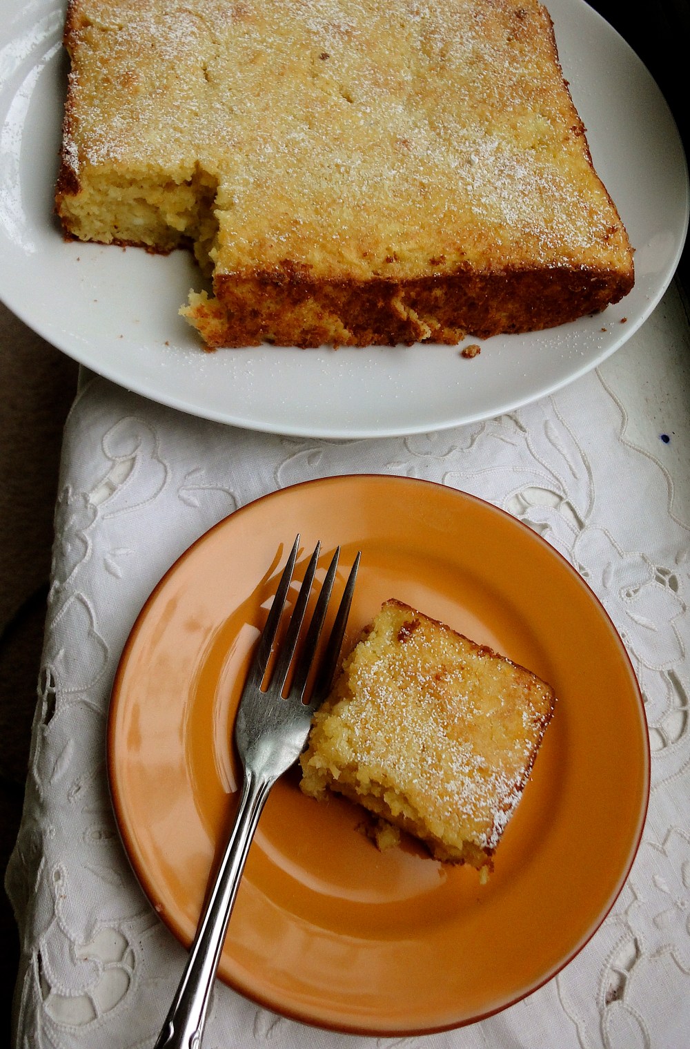 The cake that resulted was a combination of the two. It turned out beautifully – moist and golden, with flecks of orange and a heady flavor of almond and vanilla. Note: serve the cake warm or reheat before eating.