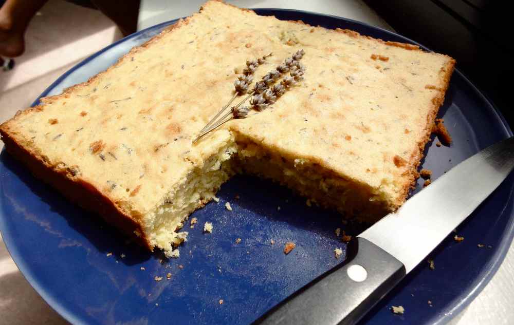 3. Fold in the flour mixture gently into the cake in three parts. Place into prepared pan and bake for 30-40 minutes, until the sides of the cake move away from the pan, the top turns a warm golden and a knife inserted into the cake comes out clean. Cool completely, and turn out of the pan. If you’d like to place lavender flowers on top of the cake, do so midway through baking, when the batter looks somewhat firm.