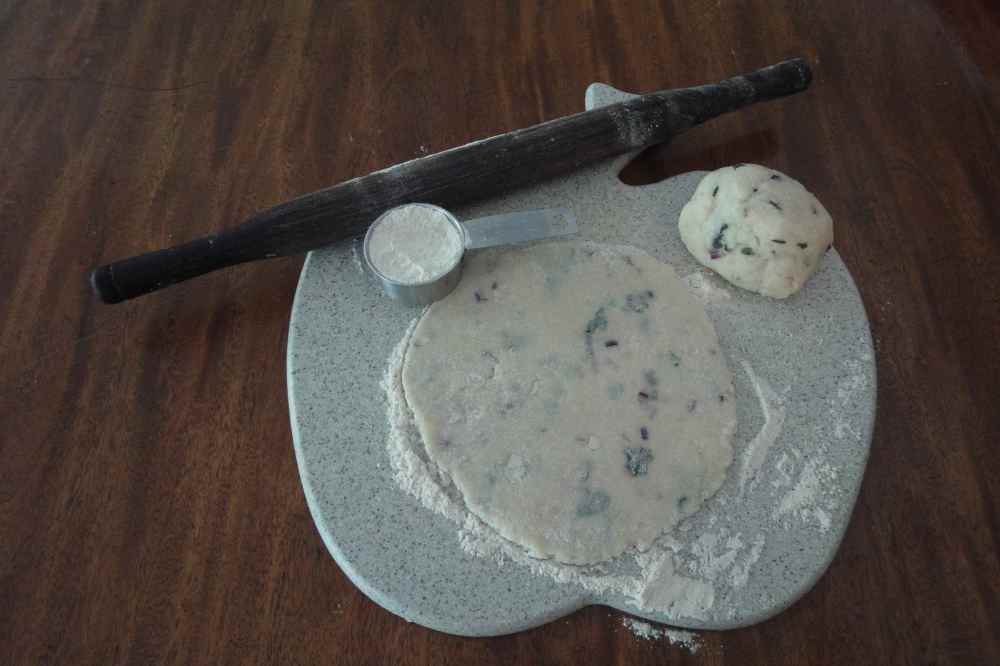 Divide the dough into small balls and roll out the dough into a 1/8 inch thick 6-7 inch disc dusting the surface well with flour as you work to prevent sticking. If the dough refuses to roll out and gets stuck, add a little more flour into the dough. The balls should roll out fairly easily. Oil your hands to prevent the dough from sticking.