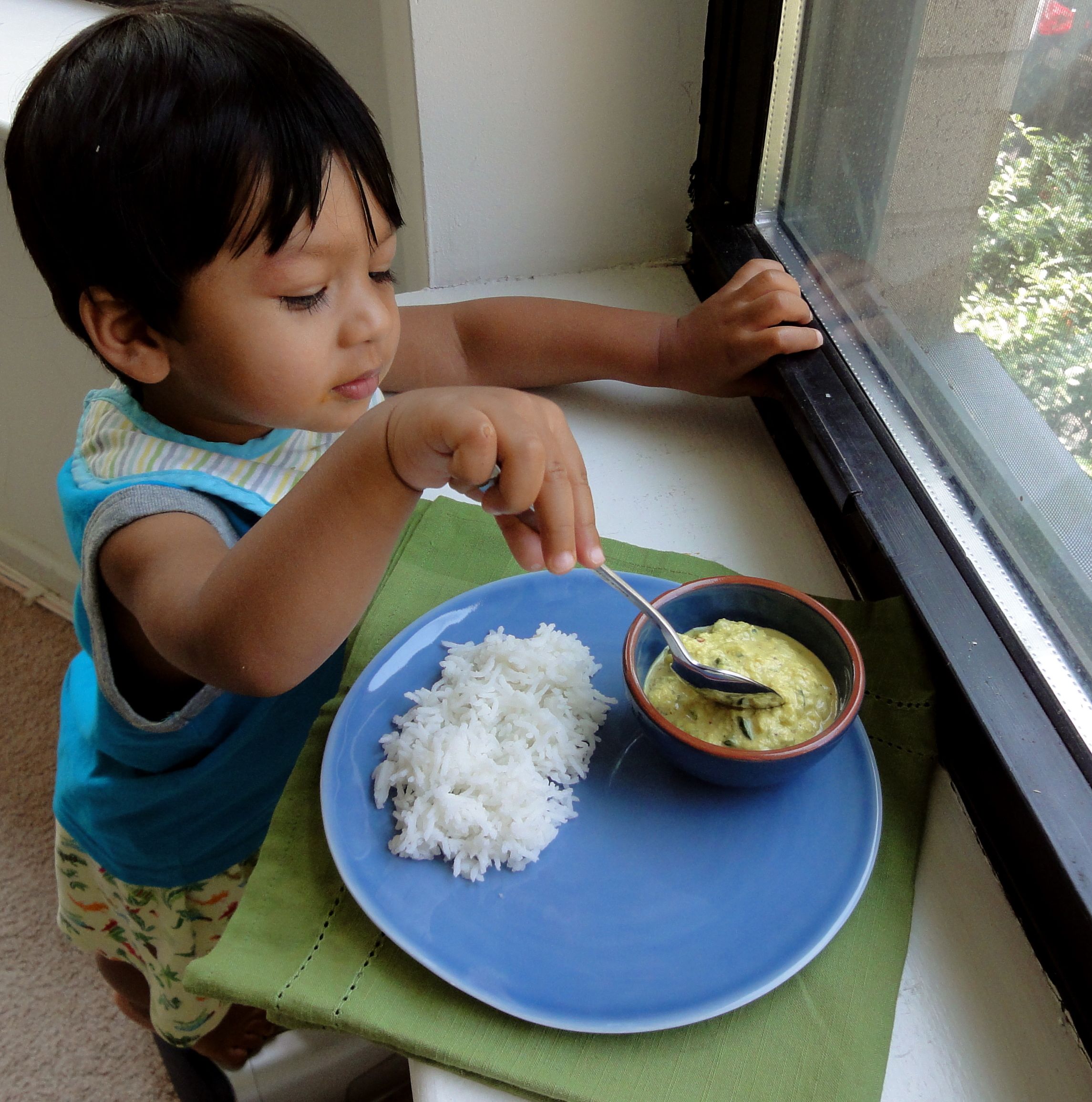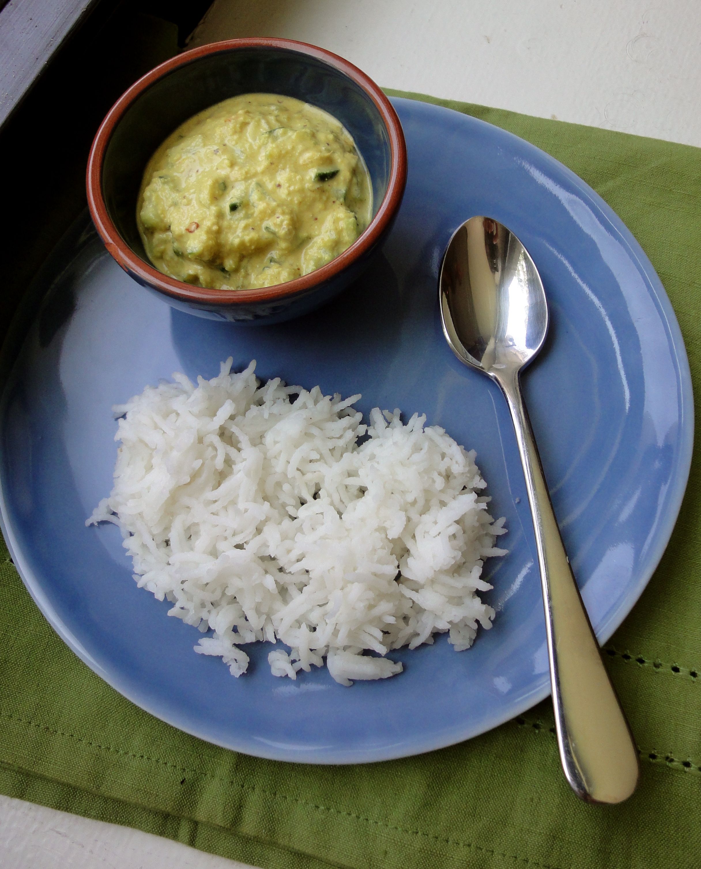 We had hot steaming rice for lunch today with a most unexpected side – a cooling cucumber relish made with a paste of black mustard seeds and white sesame seeds. Not much else was needed for a satisfying meal. I was surprised by how good the relish tasted rubbed into the rice – it was mustardy, spicy from green chillies with a hint of sour from tamarind. Finely chopped cucumbers and the ground sesame gave it an interesting texture – creamy and nutty, but studded with bites of pale green. A sort of refreshing South Indian summer pesto best enjoyed with warm rice.