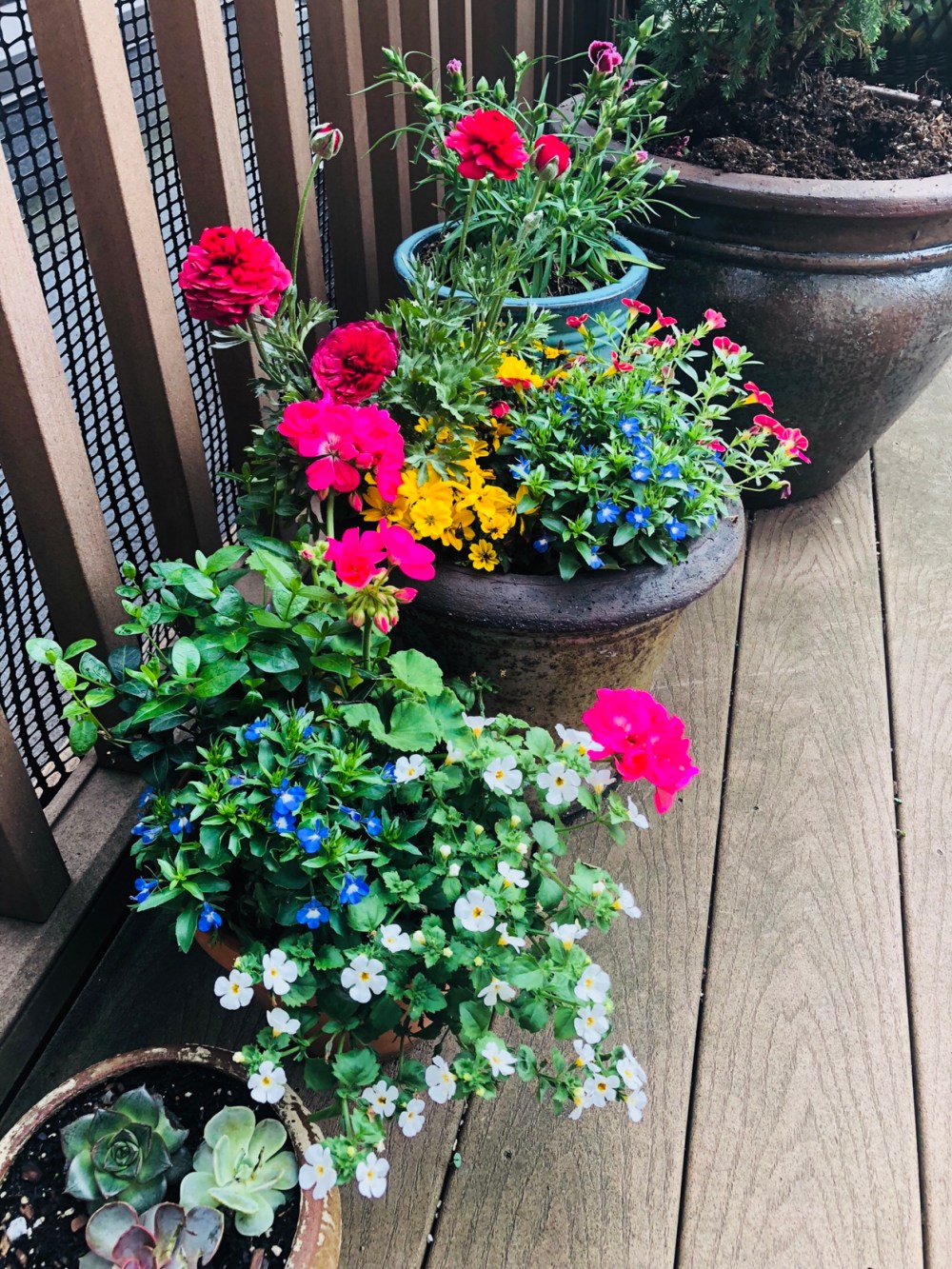 Each spring I think – I won’t spend as much time and money on plants for the deck as I did last year. There will be cold spells, vacations with no water for the thirsty plants, violent thunderstorms, big winds that uproot…. but this year, as I do each year, I feel I’ve figured out the right plants for our deck and me – I am sure they will survive my erratic watering habits, my peripatetic behavior, my love of travel.