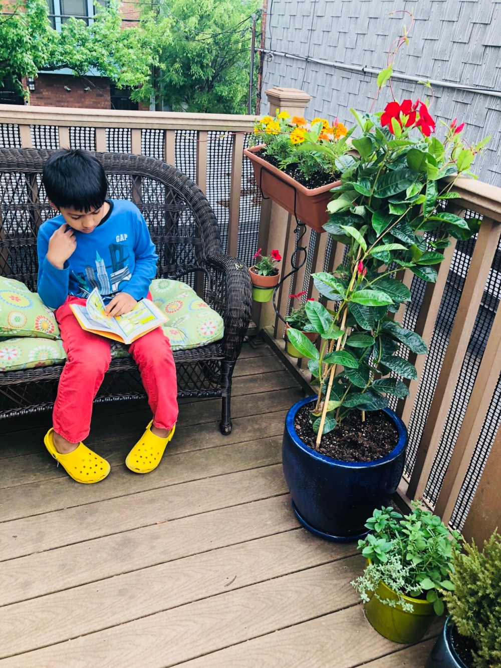 My deck is a small square space in the back of the second floor of our home. The entrance is through the living room into the playroom. Suddenly the door opens into an open patio, sky and sun above it, with a view into all the small quiet backyards on this block. You could almost miss it.