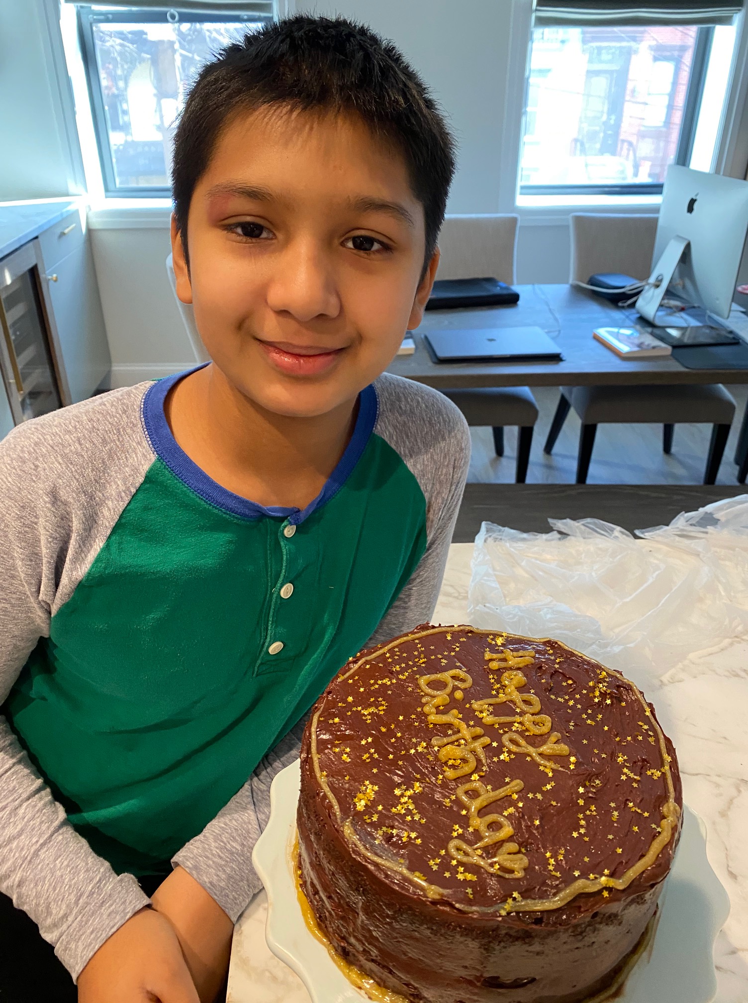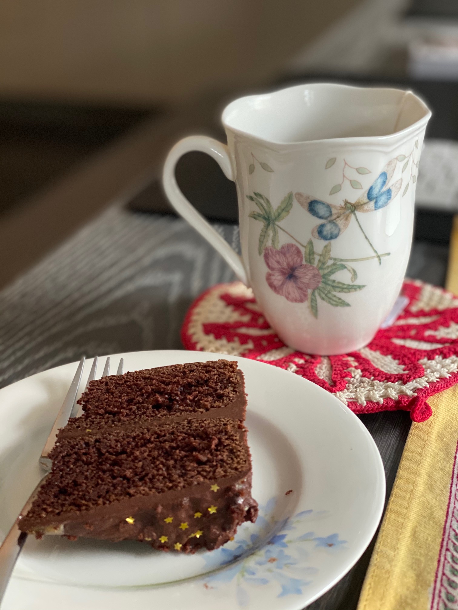 The air is still, it hangs motionless. Occasional steps on the floor above. My fingers tapping on the typewriter, soft clicks. So quiet that I can hear myself speaking words as I type. Light floods in from the windows, the sun is weak, so typical for a January afternoon. I’ve just eaten lunch, a risotto with broccoli, peas and spinach, equal proportion of rice to vegetable, as the recipe from Ellie Krieger suggests. I drop Vasisht off to school, rushing back to take a conference call at noon, so focused on the clock in the car that reads 11:57 when I return. I start the morning with a slice of cold chocolate cake with my tea, leftover from the birthday party yesterday, decorated with those tiny golden stars we find at Michael’s – a splurge but there’s something magical about fallen stars twinkling up at you from a slice of cake. ,
