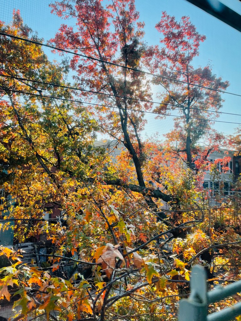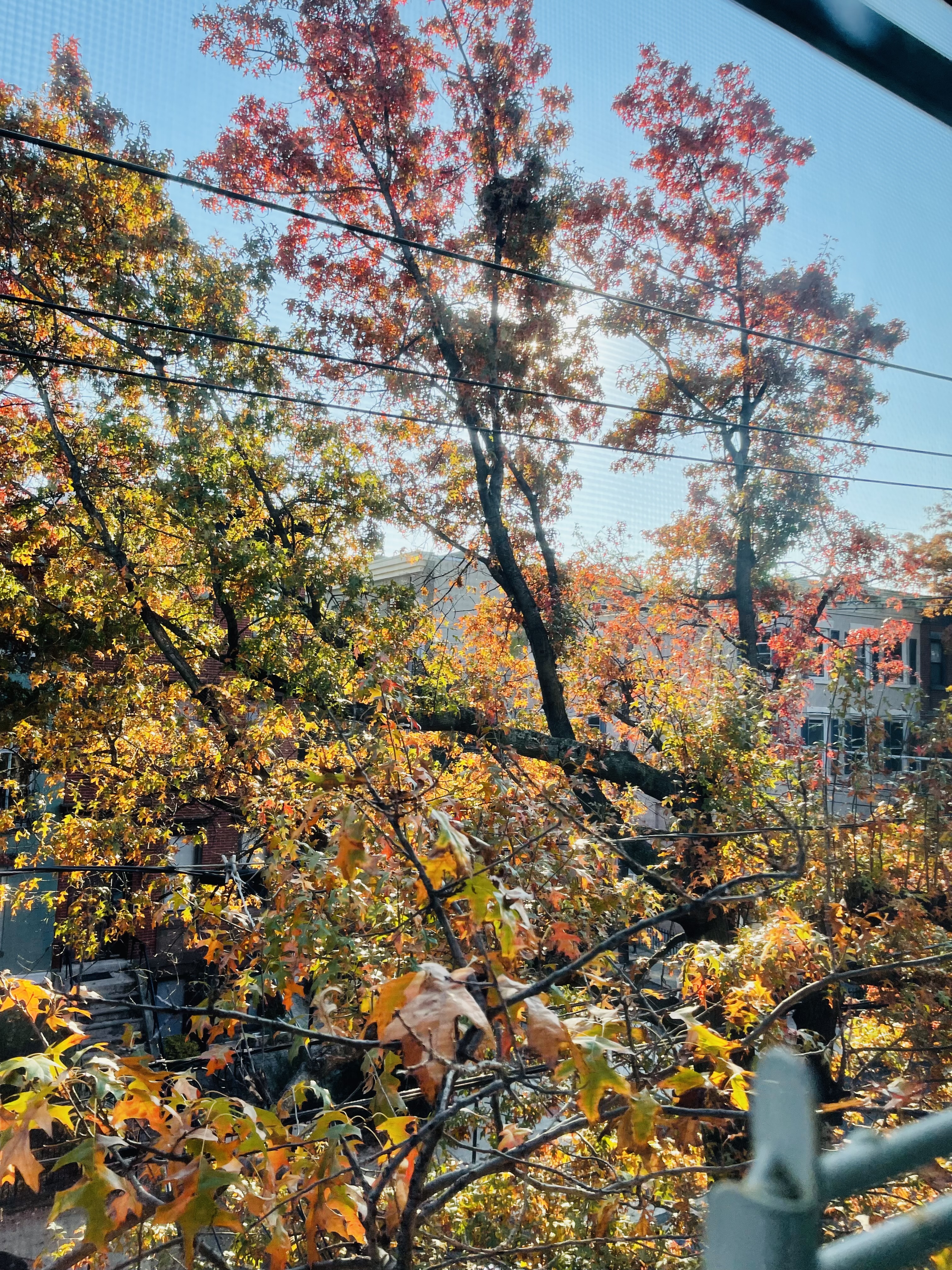 When I am outside I count the trees. I have been surrounded by five oak trees, all these years. They form a protective circle around the front of the house, their branches like arms, locking into each other. You can hardly tell where one begins and where the other ends. Electric poles and wires add to this aerial path. They are the first thing I see when I wake up in the morning. I sit and watch the sunrise with a cup of tea in my hand, waiting for the first light to hit the top of the trees. The sun rises across my window, peeking over the opposite townhouse, and moves over the house, sending warm light across the leaves. The trees are covered with a light green fuzz in the spring and then form a dense green canopy in the summer. Now, in the fall, the leaves are more sparse, yet glowing with striking reds and yellows. They twirl gently in the breeze, the sunlight so golden through the leaves. I wonder if the leaves are speaking a language. What would I be able to hear if the din of traffic stopped for a moment. I should listen harder.